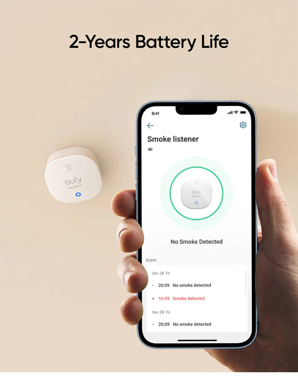 eufy Security Smoke and CO Alarm Listener lætur þig vita ef reyk- eða kolmónoxíðskynjarar gefa frá sér viðvörun.